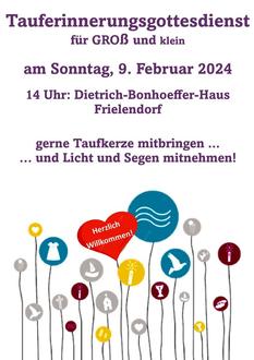 Am 9. Februar findet um 14 Uhr ein Tauferinnerungsgottesdienst besonders für die Konfi-3-Kinder im Dietrich-Bonhoeffer-Haus statt, zu dem auch die Familien herzlich mit eingeladen sind.