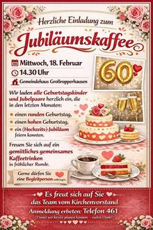 Wir laden recht herzlich alle Menschen aus unserer Gemeinde, die in den letzten Monaten einen besonderen Geburtstag oder ein Hochzeitsjubiläum feiern konnten, ein zu einem gemeinsamen Kaffeetrinken: am Mittwoch, den 18. Februar. Mai um 14:30 Uhr