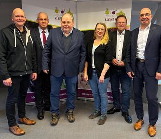 Stefan Wimmel (Geschäftsführender Gesellschafter u. Kaufmännischer Leiter Kleine Riesen Nordhessen), Vize-Landrat Jürgen Kaufmann, Kreistagsvorsitzender Michael Kreutzmann, Katharina Griesel (Referentin Fundraising und Unternehmenskommunikation Kleine Riesen Nordhessen), Landrat Winfried Becker und Michael von Bredow (Vorstand der Kreissparkasse Schwalm-Eder) (Bildautor: Stephan Bürger | Kreisverwaltung Schwalm-Eder)