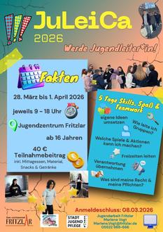 Vom 28. März bis 1. April 2026 bietet das Jugendzentrum Fritzlar in Kooperation mit den Jugendarbeiten aus Borken (Hessen) und Homberg (Efze) erneut eine Juleica-Ausbildung für Jugendliche ab 16 Jahren an. Die fünftägige Schulung qualifiziert junge Menschen für die ehrenamtliche Arbeit mit Kindern und Jugendlichen und ist Voraussetzung für den Erhalt der bundesweit anerkannten Jugendleiter*innen-Card (Juleica).