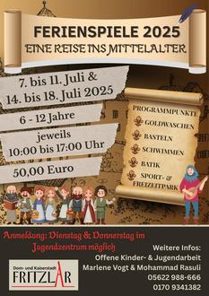 Die Sommerferien stehen vor der Tür und mit ihnen ein spannendes Abenteuer für Kinder aus Fritzlar. Die Offene Kinder- und Jugendarbeit der Stadt Fritzlar lädt auch in diesem Jahr zu ihren beliebten Ferienspielen ein. Unter dem Motto „Eine Reise ins Mittelalter“ dürfen sich Kinder im Alter von sechs bis zwölf Jahren auf eine spannende Woche voller Kreativität, Spiel und Erlebnis freuen.