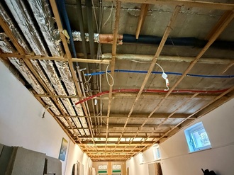 Nun endlich konnte mit den Sanierungsarbeiten begonnen werden. Die undichten Stellen am Dach wurden abgedichtet. In den Bädern wurde bereits der Estrich eingebaut, welcher nun noch für ca. 5 Wochen aushärten muss. Dann geht es weiter mit den Fliesenarbeiten.