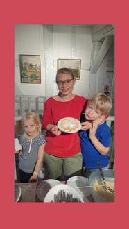 Hanna Triebfürst vom Partnerschaftsverein Fritzlar-Casina mit ihren Kindern Ida und Elias Löffel im Museumscafé.