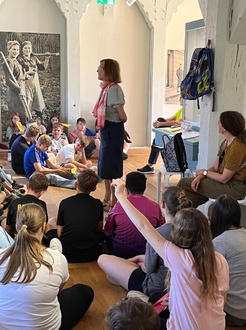 Rund 50 Schüler und Schülerinnen der Ursulinenschule (Klasse 6f1 und 6f2) kamen am 9. Juli 2024 ins Museum, um an dem Schulprojekt „Wie Geschichte und Gegenwart zusammenhängen“ teilzunehmen. Zuvor haben bereits zwei andere Gruppen dieses Angebot wahrgenommen.