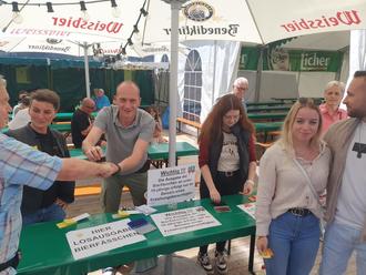 Großer Andrang, an der Losausgabe und anschließend volles Zelt beim Frühschoppen, mit der Verlosung der Bierfässchen und Hubschrauberrundflüge mit dem Katholischen Bläserchor.