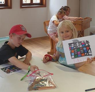Und wer Lust hatte, konnte zum Schluss sein eigenes Fachwerk gestalten. Dafür gab es Kopien mit Details von unserem Hochzeitshaus. Mit Farbe oder Mustern konnte man die einzelnen Felder bemalen. Richtig schöne Bilder sind so entstanden und selbstverständlich wurden sie im Museum aufgehängt!
