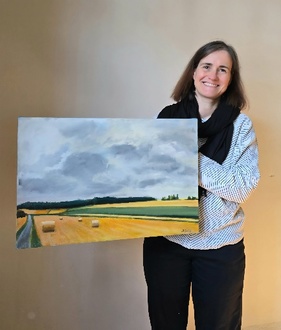 Dr. Silke Gonder mit einem modernen Bild des Künstlers Bilgaip Koçista (Bige), auf der eine Landschaft um Willingshausen heute zu sehen ist.