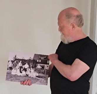 Paul Dippel mit einer historischen Fotografie, die das Wohnhaus des Malers Wilhelm Thielmann in Willingshausen zeigt.