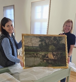 Dr. Silke Gonder und Stefanie Mnich mit einem historischen Kunstwerk des Künstlers Adolf Lins.