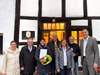 Zur feierlichen Überreichung der DTV-Urkunde gratulierten am 02.11.2024 Landrat Winfried Becker, Bürgermeister Hartmut Spogat, Tatjana Grau-Becker als Fachbereichsleiterin Wirtschaftsförderung Schwalm-Eder, Dieter Trinks als Prüfer der Kriterien für die 4-Sterne-DTV-Klassifizierung und Susanne Ebel vom Stadtmarketing Fritzlar e.V. Zahlreiche Gäste, Familienmitglieder, Freunde und Nachbarn freuten sich gemeinsam mit Familie Dubielzig.