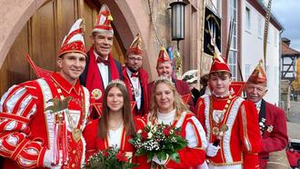 Pünktlich am 11.11.2025 ab 11:11 Uhr übernahmen das Stadtprinzen- und Kinder-prinzenpaar die Regentschaft in Fritzlar: (von links) Prinz Marcel I., Kinderprinzessin Stella I., Prinzessin Agata I. und Kinderprinz Nils I. Dahinter von links Bürgermeister Hartmut Spogat, Adjutant Pascal Prior, Frank Baumann und Otto May, Präsident der FKG Die Eddernarren e.V. Fritzlar.