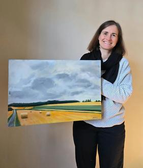 Dr. Silke Gonder mit einem Bild des Malers Bige Kocista (aktuelle Kunst aus Willingshausen)