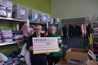 Anette Flore von der Tafel Fritzlar und Maria Weber, ehrenamtliche Mitarbeiterin im Familienzentrum. In Hintergrund ein kleiner Einblick auf die Kleiderspenden in einem Raum der Kleiderkammer Fritzlar
