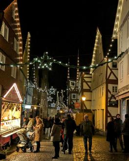 Der traditionelle Weihnachtsmarkt begeisterte zahlreiche Besucher aus nah und fern. Vom 5. bis 7. Dezember 2025 boten allerlei Verkaufsstände weihnachtliche Geschenkideen an. Mit den Lichtern in den Giebelspitzen der Fachwerkhäuser, strahlender Weihnachtsbeleuchtung und stimmungsvoller Musik verzauberte die besondere Atmosphäre die Besucher und sorgte für vorweihnachtliche Stimmung. Deftige Köstlichkeiten vom Grill und süße Leckereien verwöhnten den Gaumen. Der Nikolaus hatte sich für Samstagnachmittag angekündigt. Es wurde gemeinsam mit den Kindern Lieder gesungen und als kleines Geschenk hatte der Nikolaus für die jüngeren Besucher Schokoladen-Süßigkeiten dabei.