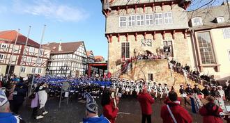 Unter blauem Himmel durften wir den 12.02.2024 in Fritzlar beginnen. Die „Narren“ waren zahlreich zur Erstürmung des Rathauses erschienen und alle gebündelten Kräfte der Verwaltung konnten der Eroberung nicht standhalten. Bürgermeister Spogat musste sich den „Narren“ ergeben und den Schlüssel des Rathauses überreichen.