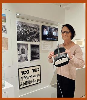 Auch diesmal gibt es wie immer mehr als nur Frühstück: Das zusätzliche kulturelle Angebot sorgt für spannende Gespräche. Nach dem Frühstück stellen wir unsere neue VR-Brille vor und zeigen den Film zum jüdischen Leben in Fritzlar. So startet Ihr Sonntag genussvoll und anregend. Auf dem Bild sehen Sie Anette Horner-Lambert vor der neuen Ausstellungseinheit mit VR-Brille.