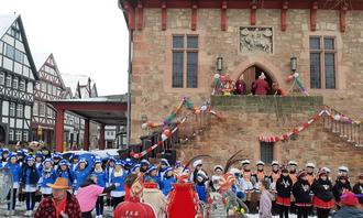 Bereits um 9.30 Uhr begann der närrische Tag mit einem der traditionellen Höhepunkte: der Rathausstürmung. Die städtischen Mitarbeiterinnen und Mitarbeiter hatten die Rathaustreppe kurzerhand mit Mülltonnen verbarrikadiert und versuchten, die anstürmende närrische Schar mit gelben Säcken vom Eindringen abzuhalten.