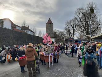 Zum Start des Festzuges zeigte sich das Wetter gnädig: Die Wolken rissen auf, zeitweise strahlte sogar die Sonne über dem närrischen Lindwurm.