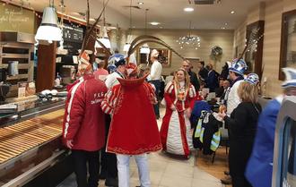 Nach dem Umzug lud der Bürgermeister die Närrischen Hoheiten zu einem kurzen Empfang in die Filiale der Bäckerei Viehmeier ein. Bei Kaffee, einem Glas Sekt und leckeren Berlinern bot sich die Gelegenheit, einmal kurz zur Ruhe zu kommen, bevor es weiter ins närrische Getümmel ging.