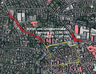 Die Bundesstraße B450 (Kasseler Straße / Am Hospital) wird ab ca. 13h voll gesperrt. Der Verkehr wird Innerorts über die Straße „Am Hohlen Graben“ und „Schladenweg“ sowie Außerorts über die L3150 (Erfurter Ring) umgeleitet.