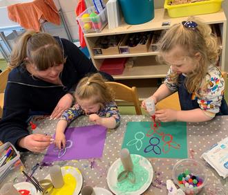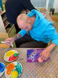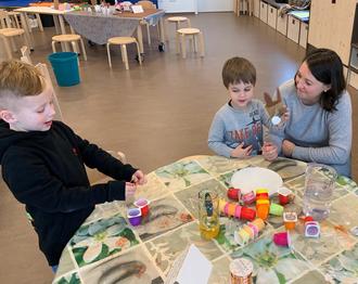 Mit Farbe wurden Keilrahmen bedruckt, Osterhäschen gedruckt und Gabeln dienten als Stempel für Tulpenbilder.