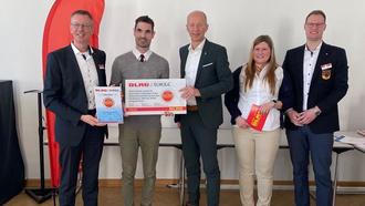 Preisübergabe in Wiesbaden (v.l.n.r.) DLRG-LV Präsident Michael Hohmann, Christoph Loose, Minister Armin Schwarz, sowie die Landes-, und Bundesbeauftragen für Schule & Hochschule Regina Nauß und Maximilian Röhr