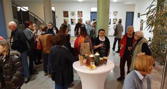 Die Gäste hatten nach der Eröffnung die Möglichkeit, in aller Ruhe durch die Gänge des Rathauses zu schlendern und die Ausstellung auf zwei Etagen zu bewundern. Die Künstlerinnen und Künstler des Acrylmalkurses waren aktiv dabei. Dadurch entstanden angeregte Unterhaltungen. Interessierten Besuchern und Besucherinnen wurden einzelne Werke und Techniken näher erläutert. Ebenso konnten Fragen und Anregungen direkt besprochen werden. Das aufmerksame und gesellige Team des Sektempfangs, sowie kleine verteilte Snacks und Leckereien, trugen zur guten Stimmung des Abends bei.