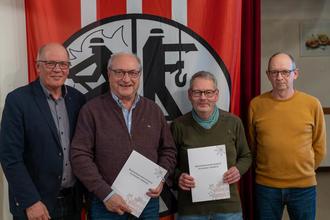 Für 25-jährige Vereinsmitgliedschaft wurde die Kameraden Wolfgang Arend (2. v. l.) und Harald Arend (2. v. r.) geehrt. Links im Bild der Vorsitzende Thomas Auel, rechts Stellvertreter Heiko Berninger.