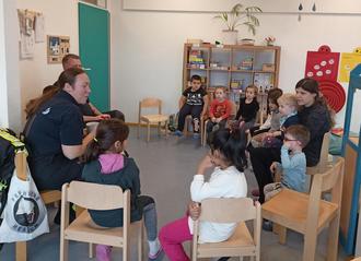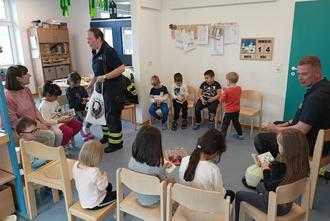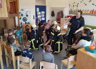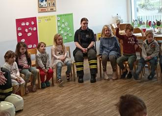 Der Höhepunkt für alle Kinder, die noch nicht zu den „Großen“ gehören, war der Besuch der Brandschutzerzieher der freiwilligen Feuerwehr. Zunächst wurden die Kinder im Morgenkreis darauf vorbereitet, indem die Kinder ihre Erwartungen und Fragen formulieren konnten. Anschließend stand ein Einsatzfahrzeug bereit, das von innen besichtigen werden konnte – sicherlich ein unvergessliches Erlebnis für alle Feuerwehrfans und Kinder, die bis zu diesem Tag kaum Berührungspunkte mit der Feuerwehr hatten. Wir danken der freiwilligen Feuerwehr für den Einsatz vor Ort in der Kita. Sie hat einen wichtigen Teil dazu beigetragen, dass auch die Kleinsten einen Zugang zum Thema „Brandschutz“ bekommen konnten.