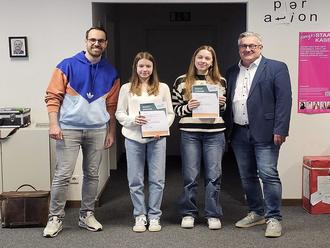 Drei Schülerinnen überzeugten die Jury in besonderem Maße mit ihren Präsentationen zu einem naturwissenschaftlich-mathematischen Thema und qualifizierten sich damit für das Landesfinale des Bundeswettbewerbs „Jugend präsentiert“. Mit ihren Präsentationen „Wie funktioniert Air up?“ und „Warum leuchten Katzenaugen im Dunkeln?“ belegten Lea Reith (8a) und Raissa-Elena Vais (8d) den geteilten ersten Platz, gefolgt von Sanna Bruer (7d), die mit ihrer Darbietung „Können Elefanten mit den Füßen hören?“ den dritten Platz erreichte.