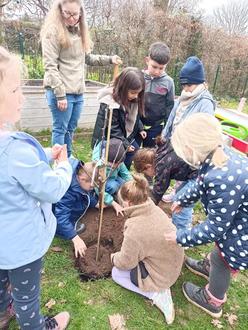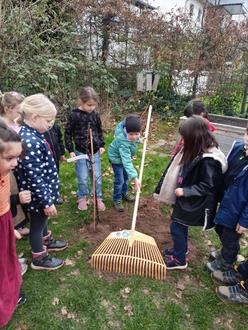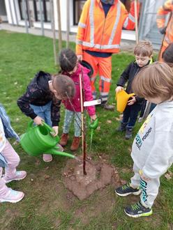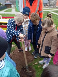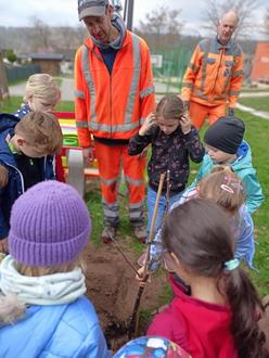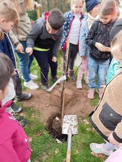 Unter der fachmännischen Anleitung von Herrn Joedecke und Herrn Schmidt (Gärtner der Gemeinde Fuldabrück) pflanzten die Vorschulkinder am 21.03.2024 einen Apfel- und einen Walnussbaum. Tatkräftig halfen alle mit. Die Rasenkante wurde abgestochen, ein Loch gegraben, die Erde im Loch gelockert, für einen guten Start zum Wachsen wurden Hornspäne mit der Erde vermengt. Anschließend kam der Baum in das Pflanzloch, nun wurde alles vorsichtig mit Erde aufgefüllt, mit dem abgestochenen Rasen bauten wir eine Pflanzmauer und zuletzt wurde kräftig gegossen.