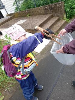 Nachdem alle Kinder gut ausgerüstet waren, ging es los. Raus aus der Zwergenburg, auf der Suche nach dem Müll. Doch weit mussten wir gar nicht laufen! Schon auf unserem Fußweg vor dem Kindergarten haben wir einiges an Müll gefunden. Die Kinder hoben den Müll fleißig mit ihren Zangen auf und sammelten ihn in Mülltüten, die wir bereit hielten.
