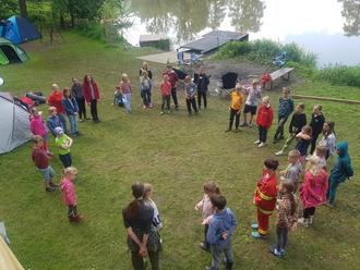 Frühstück und Abendessen wurde vor Ort zubereitet, das Mittagessen wurde von „Kochfrauen“ (Michaela, Birgit, Petra, Tanja und Andrea) in der Unterkunft am Freibad gekocht und pünktlich, heiß am Zeltplatz angeliefert. Ein buntes Programm mit Nachtwanderung, Bemalaktion von T-Shirts, eine Geschicklichkeits-Olympiade, Karaokewettbewerb, aber auch Zeit zum Abhängen, Stocheln am Lagerfeuer, kleine Ausflüge mit Kanus oder Fahren mit den Motorbooten ließ keine Langeweile aufkommen. Bei schwach beleuchtetem Platz stellte eine Nachtwache die Sicherheit auch nach Einbruch der Dunkelheit sicher. Der Pfingstmontag erwachte bei strahlendem Sonnenschein. Heute waren die Eltern mittags zum gemeinsamen Abschluss-grillen eingeladen die mit mitgebrachten, schmackhaften Salaten nicht geizten. Als Gäste konnten wir ebenfalls die Bürgermeister aus Fuldabrück und Lohfelden, Andreas Damm und Uwe Jäger, begrüßen, die den Nachtisch spendierten und leckeres Eis verteilten.