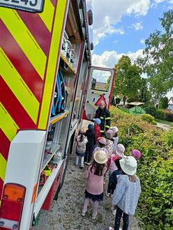 Der krönende Abschluss der Woche fand am Freitag statt: Die Freiwillige Feuerwehr Bergshausen war zu Gast! Brandschutzerzieher besuchten die Gruppen beim Morgenkreis und erklärten kindgerecht den Umgang mit Feuer und Gefahrensituationen. Anschließend durften alle Kinder ein echtes Feuerwehrauto besichtigen. Groß war die Aufregung, als sich die Türen öffneten und viele Fragen gestellt wurden: „Wo ist der Wasserschlauch?“, „Darf man da mitfahren?“