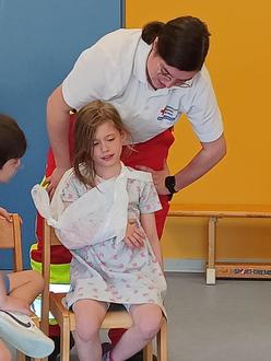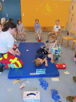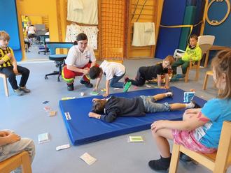 Sie hat den Kindern gezeigt, wie man eine bewusstlose Person in die stabile Seitenlage bringt und wie Verbände angelegt werden.