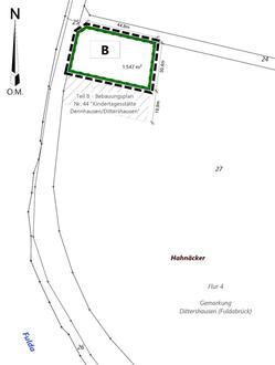 Des Weiteren werden auf dem Flurstück Nr. 27 (teilw.) der Flur 4 in der Gemarkung Dittershausen ca. 0,15 ha als externe Ausgleichsmaßnahmen im Planteil B - Kompensation vorgesehen. Die Flächen liegen südwestlich des Ortsteils Dennhausen/Dittershausen im Bereich der Fuldaaue. Die Abgrenzungen des Planteils B - Kompensation sind aus der nachfolgenden Karte ersichtlich.