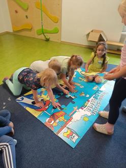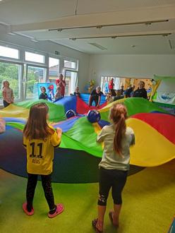Die Vorschulkinder der Kita Bergshausen hatten am 21.05.2024 Besuch von einem Team des DLRG Lohfelden-Fuldabrück. Bei verschiedenen Aktionen mit vielen Erklärungen drehte sich alles um die Sicherheit am und im Wasser. Gemeinsam wurde gepuzzelt, getanzt und sich mit dem Schwungtuch bewegt. Alle Kinder waren begeistert bei der Sache und hatten viel Spaß. Es gab auch ein Kaspertheaterstück in dem die Baderegeln und das richtige Verhalten in der Sonne vermittelt wurde. Der Besuch von „Nobbi“ war zum Abschluss eine besondere Überraschung.