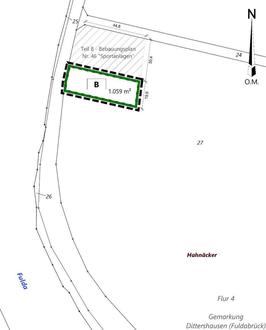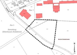 Des Weiteren werden auf dem Flurstück Nr. 27 (teilw.) der Flur 4 in der Gemarkung Dittershausen ca. 0,1 ha als externe Ausgleichsmaßnahmen im Planteil B – Kompensation vorgesehen. Die Flächen liegen südwestlich des Ortsteils Dennhausen/Dittershausen im Bereich der Fuldaaue. Die Abgrenzungen des Planteils B – Kompensation sind aus der nachfolgenden Karte ersichtlich.
