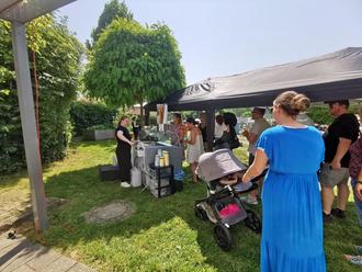Für herrliche Abkühlung sorgte der Gartenschlauch, der kurzerhand zur Nebeldusche umfunktioniert wurde. Bei den Kindern sorgte das für quietschvergnügte Begeisterung – ein willkommener Spaß bei sommerlicher Hitze.