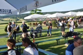 Am Freitag, den 20. Juni dann der Start in das Hauptwochenende mit einem ganz besonderen Startpunkt, dem Dach der GrimmWelt. Der Geschäftsführer der GrimmWelt Kassel, Jan Sauerwald, war leider verhindert und so gab Markus Exner, Projektleiter und „Gesicht“ der GrimmHeimat Nordhessen, den Startschuss für die 105 km-Strecke. Insgesamt fast 40 Hardcore-Wanderer machten sich von dort auf den Weg zur Königs-Alm. Nach einem Pastaessen auf der Königs-Alm führte der Weg, gemeinsam mit den ca. 60 GrimmSteig-Classic-Wanderern, über 85 km weiter auf dem GrimmSteig. Musikalisch begleitet wurden die Wanderer auf der Königs-Alm durch das Bläserensemble der Musikschule SKW. Die Wanderer konnten also beschwingt auf die restlichen 85 km gehen.