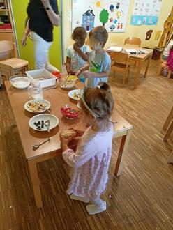 Am Donnerstag wurde mit einem gesunden Frühstück in den Tag gestartet. Die Kinder konnten sich aus einem Buffet ein leckeres Frühstück zusammenstellen. Müsli, Vollkornbrot, Butter, Gemüse wie Gurken und Paprika, Käsewürfel, Frischkäse und Obst kamen bei den Kindern sehr gut an und alle waren glücklich und zufrieden nach dem Essen.