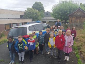 Wir begrüßen Herrn Imke und gingen zunächst zum Polizeiauto vor der Kindertagesstätte.