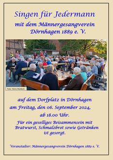 Auch in diesem Jahr bietet der Männergesangverein Dörnhagen wieder allen FreundInnen des fröhlichen Singens beliebter Volkslieder und Melodien aus der Welt des Schlagers die Möglichkeit, sich im Kreis vieler netter Gleichgesinnter einen vergnüglichen Abend zu gönnen.