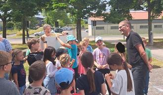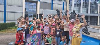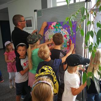 Die Kinder füllten alle Quizbögen selbstständig aus. Nach so viel Trubel machten wir ein Picknick vor dem Rathaus und ließen es uns mit Eis zum Nachtisch gut gehen. Den Vorplatz verschönerten wir mit Straßenmalkreide und hinterließen Farbenprächtige Bilder und Wappen. Als Dankeschön für die tolle Vorbereitung und die vielen Informationen und Mitmachaktionen, überreichten wir stellvertretend dem Fachbereichsleiter Oliver Brandenstein unser Geschenk: Jedes Kind hat im Vorfeld ein eigenes Puzzleteil gestaltet. Es wurde gemalt, geklebt und der Fantasie freien Lauf gelassen. Zusammengesetzt ergeben die Puzzleteile einen Baum, welcher nun im Foyer des Rathauses betrachtet werden kann. An dieser Stelle noch einmal ein großes Dankeschön an das Team der Sommerferienbetreuung und die Angestellten des Rathauses, für diesen schönen Nachmittag! Der Heimweg war voll mit Eindrücken und Begeisterung. Pünktlich kamen wir in der Schule an. Die Auswertung der Gruppen des Rathaus-Quiz gab es am nächsten Tag. Natürlich mit Siegerehrung und Schatzkiste. Alle waren sich einig: Das war ein toller Ausflug.