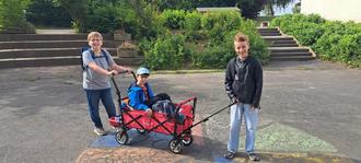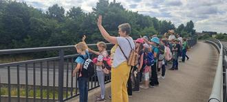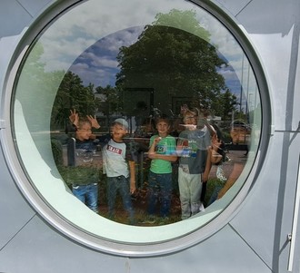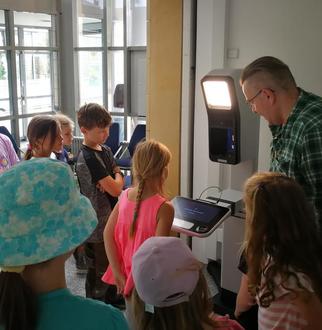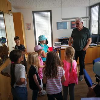 Am Donnerstag, den 10. Juli starteten wir nach dem Frühstück gut bepackt, mit Bollerwagen, Musikbox und Getränken, Richtung Dörnhagen. Das Wetter war super und der Weg kam uns gar nicht lang vor. Auf der Brücke grüßten uns viele LKW Fahrer per Signal zurück. Das war klasse! Am Rathaus angekommen ließen wir uns im Schatten am Hochzeitsbrunnen nieder. Wir wurden in 3 Gruppen eingeteilt und schon konnte es losgehen. Das beliebte Rathausquiz führte uns durch alle 3 Etagen. Vom Trausaal im Erdgeschoss, über die 1. Etage mit der Kiste im Flur, bis zum Sitzungssaal unter dem Dach. Wir besuchten den ersten Beigeordneten Hans Stäbe im Büro des Bürgermeisters und durften auch den angrenzenden Besprechungsraum anschauen. Im Bürgerbüro erfuhren wir, wie man einen Ausweis beantragt und durften sogar den neuen Passbildautomat ausprobieren. Wir besuchten das Ordnungsamt und konnten die Frage „Welche Farbe die Uniform hat“ klären. Wir durften die Stopp-Kelle ausprobieren und wissen jetzt viele Tätigkeiten, die das Ordnungsamt in Fuldabrück übernimmt. Auch das besondere am Trausaal war schnell geklärt: das große runde Fenster, welches uns ein bisschen an Schiff fahren erinnert hat. Der Fahrstuhl aus Glas war ein Highlight. Wir wissen jetzt, wo das zweite Klavier im Rathaus steht. Sie auch?