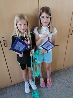 Vom Wollknäuel und ein paar Ästen zum fertigen Indianerauge: Sichtlich stolz präsentieren die Kinder ihre Werke, an denen sie lang gewickelt haben!
