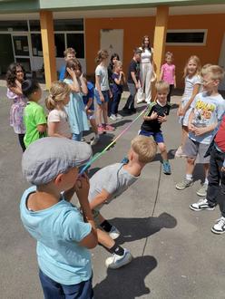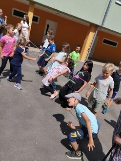 Die nagelneuen langen Regenbogenseile der Jugendarbeit wurden für verschiedenste Spiele eingesetzt: Beim Limbo beeindruckten die Kinder mit extremer Beweglich- und Körpergeschicklichkeit und das Cola, Fanta, Sprite Spiel entwickelte sich innerhalb der Woche zu richtig ehrgeizigen Wettkämpfen, bei denen mit viel Konzentration und guten Koordinationsfähigkeiten stark gepunktet wurde. Bei anderen Seilspielen, die die Teamfähigkeit trainieren, konnten die Kids außerdem unter Beweis stellen, wie gut sie miteinander kommunizieren, eigene Ideen und Lösungsvorschläge konstruktiv in eine Gruppe einbringen, sich aber auch auf andere einstellen können, um gemeinsam zum Ziel zu kommen.