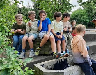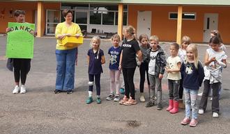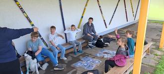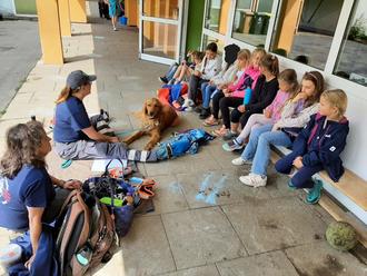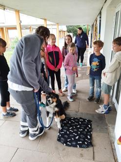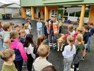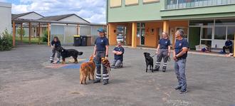 Die Hundestaffel des DRK kam dieses Jahr mit 9 Hundeführer/innen. Wahnsinn! Da war was los auf dem Schulhof. Nach einer Begrüßungsrunde wurden wir in 3 Gruppen eingeteilt. Die Hundeführer/innen hatten sich auf dem Gelände verteilt und verschiedene Workshops vorbereitet. Die Kinder lernten in einem Ampelsystem das Verhalten von Hunden zu lesen und zu deuten. Das gelang überraschend gut. Das absolute Highlight war neben den Tieren das Einsatzfahrzeug. Wir durften uns hineinsetzen und bekamen sehr eindrücklich erzählt, wie ein Einsatz abläuft und wer, was macht. Auch die dafür benötigten Materialien durften wir anschauen und teilweise auch ausprobieren. Der Hundeanhänger bekam besonders große Aufmerksamkeit: die Kinder durften selber darin Platz nehmen und einmal Rettungshund sein. Das war super! Eine 1. Hilfe Einheit durfte natürlich auch nicht fehlen: die Kinder wurden verarztet, mit einem Tuch transportiert und ein Notruf durchgespielt bzw. abgesetzt. Hungrig ging es Mittags dann für alle zur Gulasch-Kanone. Diese hatte unsere Koch-AG bereits liebevoll vorbereitet. Bei strahlendem Sonnenschein ließen wir es uns auf dem Schulhof gut schmecken. Danach wurde es spannend: In Kleingruppen durften wir Einsätze nachspielen. Die hälfte der Gruppe versteckte sich auf dem Gelände. Die andere hälfte der Gruppe war „Sucher“ und folgte den Hunden beim aufspüren. Die Hunde des DRK sind entweder „Verbeller“ welche mit Laut anzeigen wo Personen sind oder „Läufer“, welche zwischen den Personen und dem Hundeführer/in hin und her pendeln. Egal wie, alle Hunde haben einen super Job gemacht und die vermissten Kinder wurden teilweise in Rekordzeit gefunden! Die Leckerlis zur Belohnung waren mehr als verdient. Zum Abschluss des Tages erhielt jedes Kind von der Hundestaffel eine Teilnehmerurkunde. Vielen Dank dafür! Auch wir hatten uns gut vorbereitet: die Kinder hatten zwei Tage vorher bereits eigene Hundemarken für jedes Tier mit Namen und Bildern per Schrumpf-Folie gebastelt. Mit vielen Ideen und Kreativität entstanden wahre kleine Kunstwerke. Auch die Hundeführer/Innen erhielten eigens gestaltete und personalisierte Anhänger, sowie selbst bedruckte Transport-Täschchen. Die Kinder haben sich sehr viel Gedanken und Mühe gegeben, das hat man dem Ergebnis auch angesehen. Ehe man es sich versah, war einer der schönsten Tage der Sommerferienbetreuung auch schon vorbei.