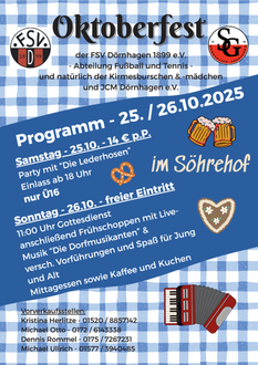 Wir freuen uns sehr, nach der Kirmes 2024, in diesem Jahr, gemeinsam mit den Abteilungen Fußball (SG) und Tennis, sowie den Kirmesburschen und -mädchen, ein Oktoberfest für unseren Ort zu organisieren.