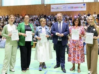 Staatsminister Timon Gremmels und die Klassenlehrerinnen des neuen Jahrgangs 5